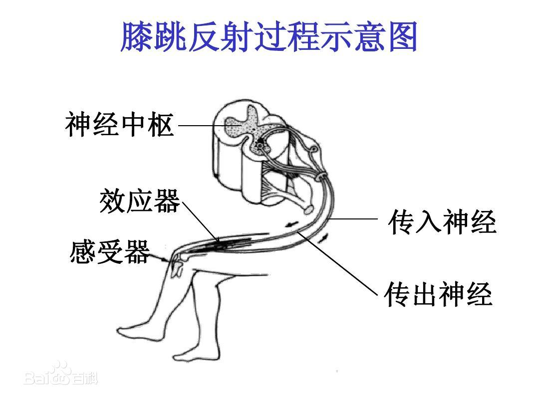 在膝关节于半屈和小腿自由下垂时,轻快地叩击膝腱,引起股四头肌收缩,使小腿作急速前踢的反应。此反射属于膝跳反射。其感受器是能感受机械牵拉刺激的肌梭。肌梭为一般的肌纤维并行排列,形如梭,两端附着在肌腱上(或梭外肌纤维上)、外有结缔组织囊。囊内含2~12根特化的肌纤维,其中部充满细胞核,无横纹,能感受牵拉刺激。两端有横纹,有收缩力。当叩击膝关节下肌腱时,由于快速牵拉肌肉,梭内肌纤维收缩时,使肌梭感受部分受到刺激而发放神经冲动,由位于股神经内的传入神经纤维传向脊髓(腰部2~4节)。腱反射是单突触反射,传入神经纤维直接与传出神经元的胞体联系。冲动由位于股神经内的传出纤维传递至效应器股四头肌的运动终板,从而引起被牵拉的肌肉收缩,使小腿前伸。此反射通常受中枢神经系统的高级部位影响,其反应的强弱、迟速可反映中枢神经系统的功能状态。