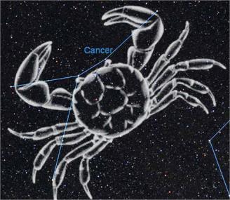尽管巨蟹座亮星寥寥,但古人却很早就注意到它了,古希腊天文学家托勒密提出的48个星座中就有巨蟹座。中国古代把巨蟹座区域星空称为鬼宿和柳宿。