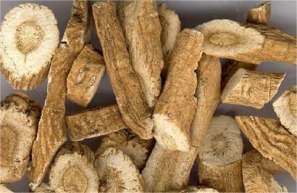 本品呈圆形的厚片。外表皮淡灰黄色至淡棕黄色,有纵皱纹。切面皮部黄白色,木部黄色。气微,味微甜后苦涩。