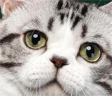 头部:美国短毛猫头圆且大,两颊丰满,耳大略呈圆形。眼睛大而圆,炯炯有神,稍吊眼梢。根据皮毛不同而呈现各种颜色。