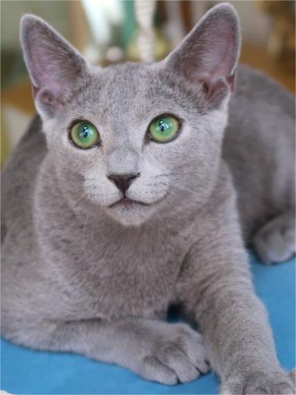 蓝猫:(毛发独特,质地似海豹皮,颜色应是中等深度的纯蓝色,泛出银色光泽,鼻子和掌垫也是蓝色,但幼猫除外,杏仁状眼镜应是非翠绿色。