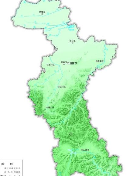 淄博市地势南高北低,南部及东西两翼山峦起伏,中部低陷向北倾伏,南北高差千余米。以胶济铁路为界,以南大部分为山区、丘陵,岩溶地貌发育;以北大部分为山前冲积平原和黄泛平原,土地平坦肥沃。北部有黄河、小清河流经,发源于市域内的河流有沂河、淄河、孝妇河等。山区、丘陵、平原面积分别占市域面积的42.0%、29.9%和28.1%。